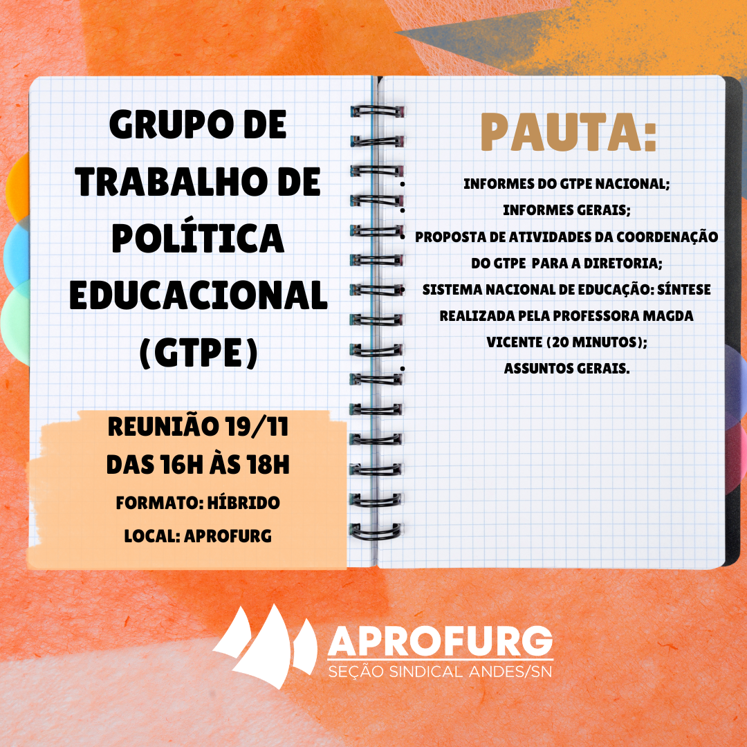 O Grupo de Trabalho de Política Educacional (GTPE) vai se reunir na quarta-feira, dia 19 de novembro, a partir das 16h, em formato híbrido.