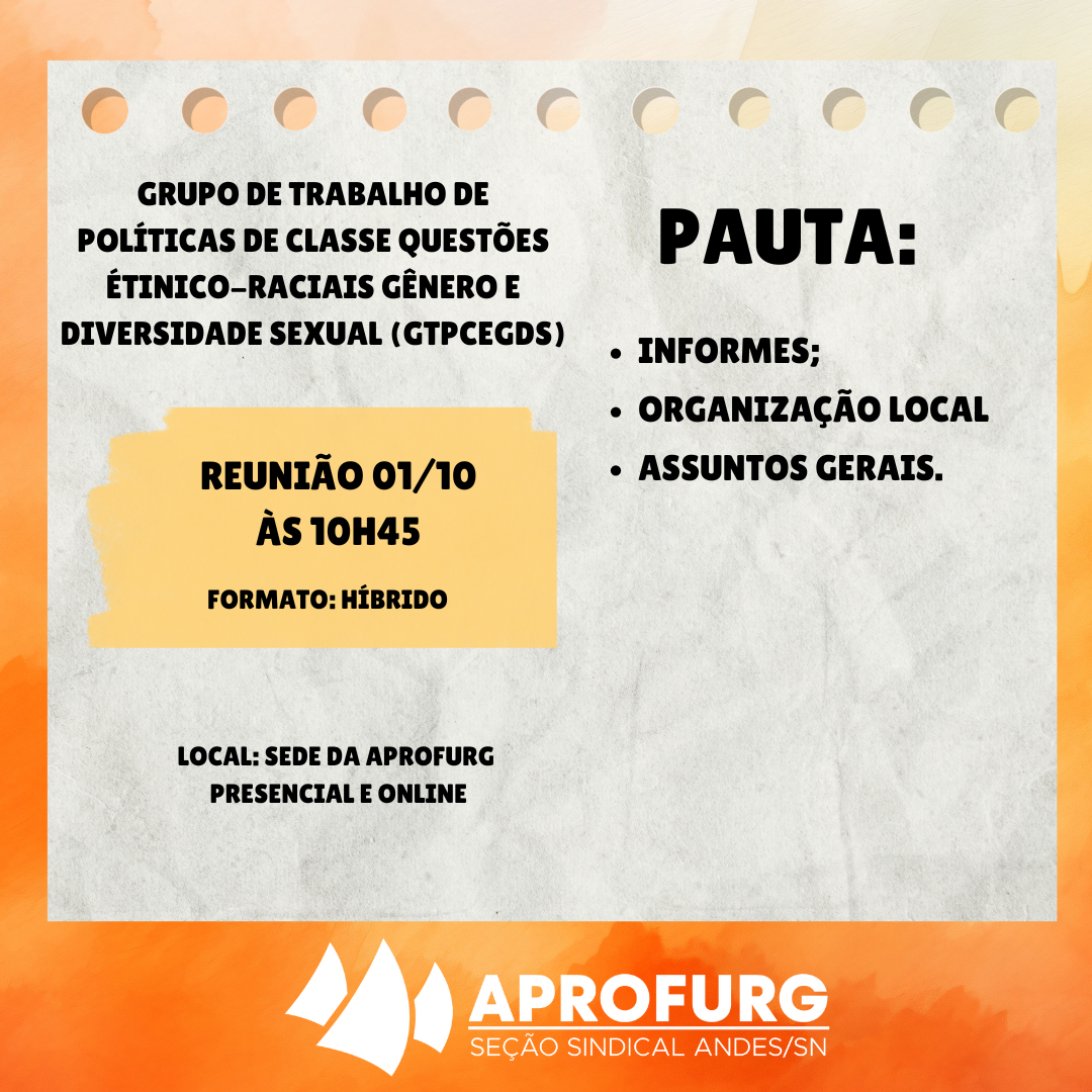 O Grupo de Trabalho de Políticas de Classe Questões Étnico-Raciais Gênero e Diversidade Sexual (GTPCEGDS) vai se reunir na próxima quarta-feira, 01 de outubro, às 10h45, em formato híbrido (presencial e online).
