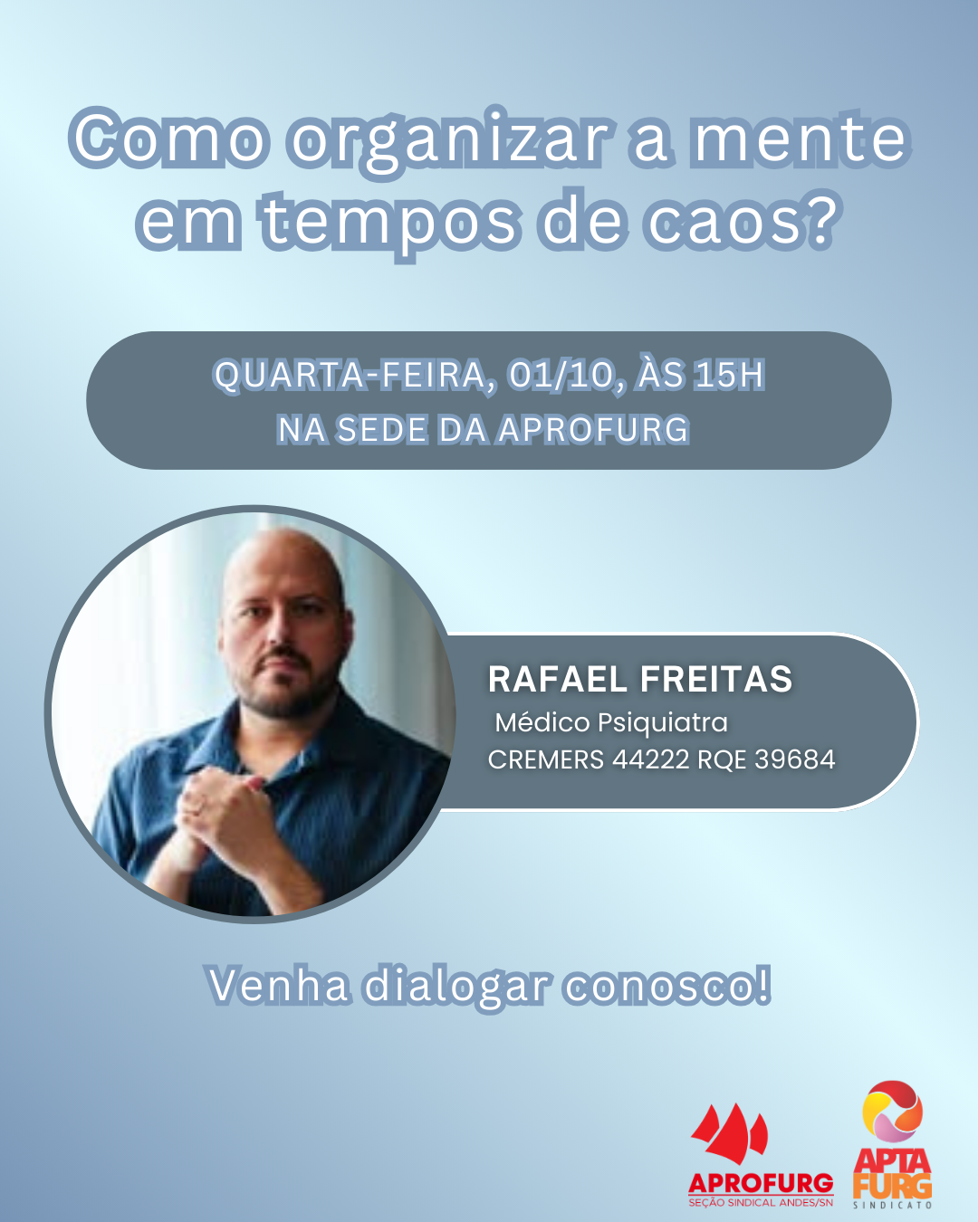 Na próxima quarta-feira, 01/10, às 15h, teremos um diálogo especial na sede da APROFURG com o médico psiquiatra Rafael Freitas.
