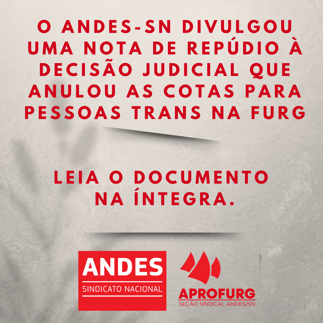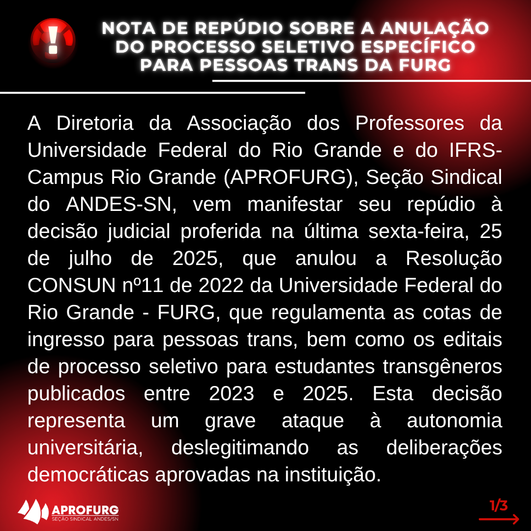 A Diretoria da Associação dos Professores da Universidade Federal do Rio Grande e do IFRS-Campus Rio Grande (APROFURG), Seção Sindical do ANDES-SN, vem manifestar seu repúdio à decisão judicial proferida na última sexta-feira, 25 de julho de 2025, que anulou a Resolução CONSUN nº11 de 2022 da Universidade Federal do Rio Grande - FURG, que regulamenta as cotas de ingresso para pessoas trans, bem como os editais de processo seletivo para estudantes transgêneros publicados entre 2023 e 2025. Esta decisão representa um grave ataque à autonomia universitária, deslegitimando as deliberações democráticas aprovadas na instituição.