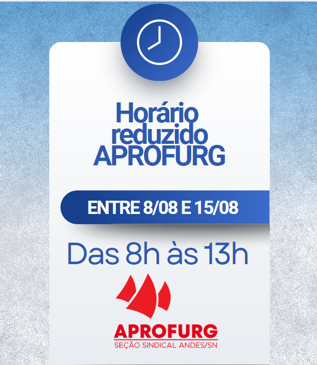 A APROFURG - Seção Sindical do ANDES-SN vai trabalhar em horário reduzido a partir desta sexta-feira, dia 8 de agosto até o próximo dia 15 de agosto, entre 8h e 13h.